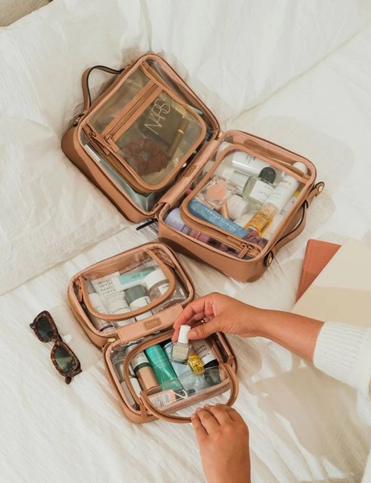- Coisa de higiene pessoal e maquiagens, podem e dever ir em uma frasqueira pequena de mão.