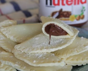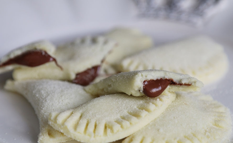 - Abra a massa com um rolo, corte círculos, recheie com nutella e feche o pastel, apertando as bordas com a ajuda de um garfo.